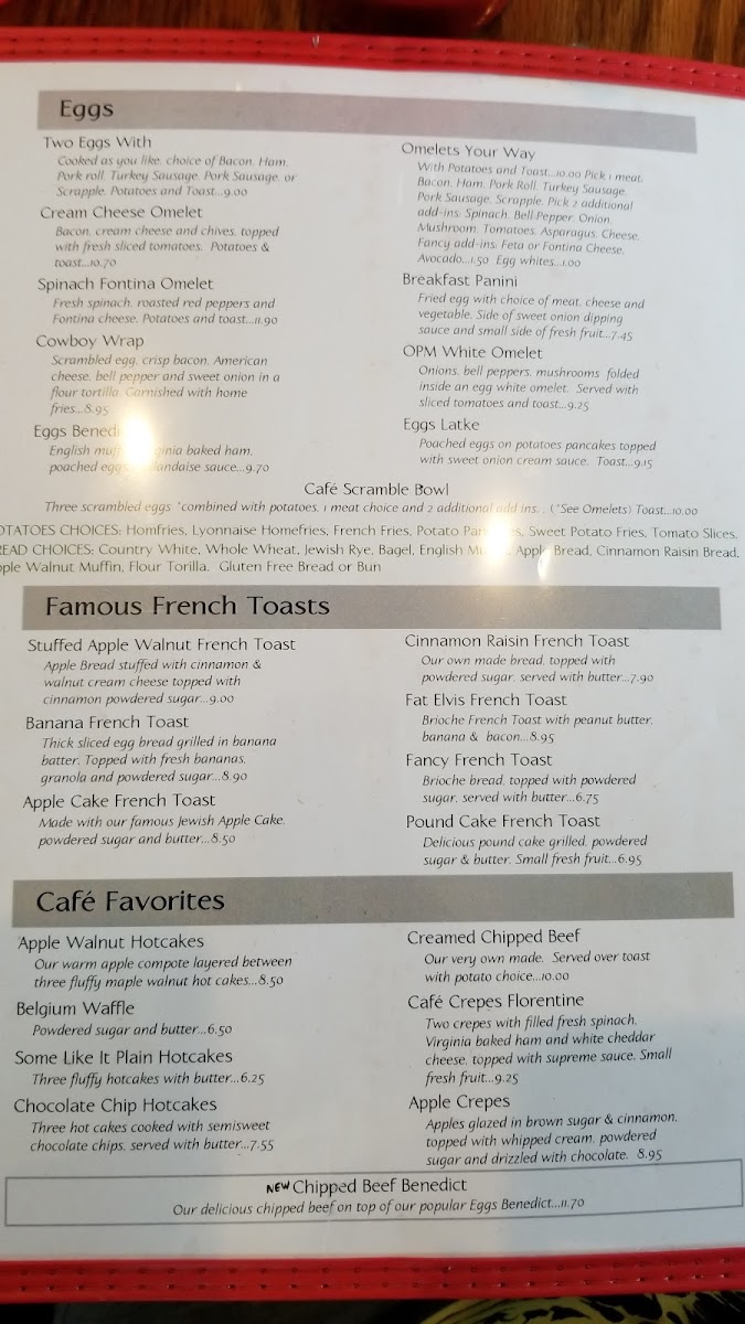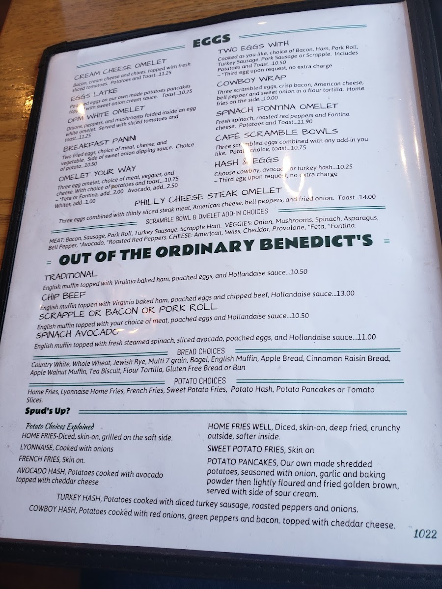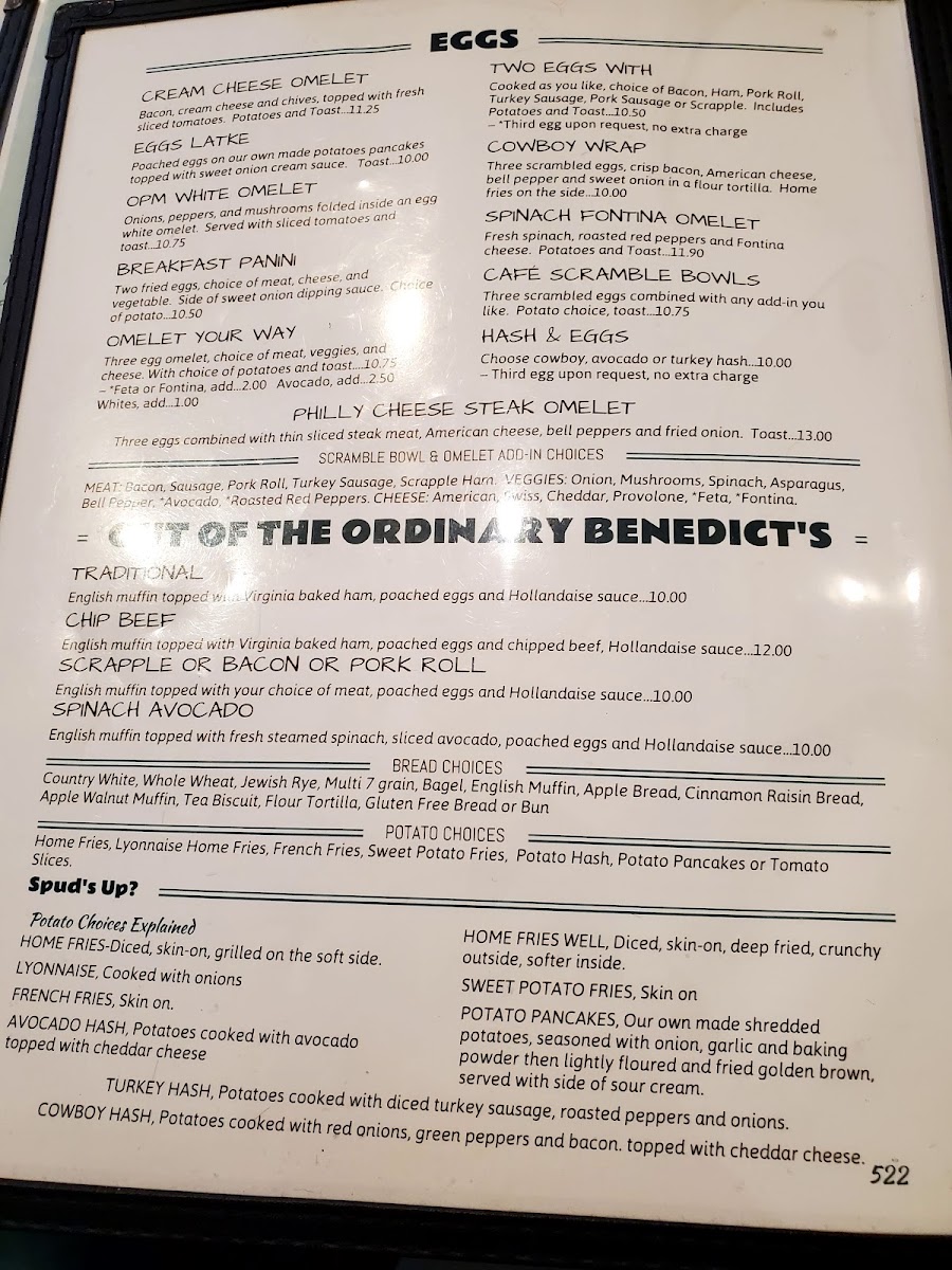 With potatoes and toast. Meat Choice: Bacon, Ham, Pork Roll, Pork Sausage, Scrapple. Omelets 2 Topping Choice: Asparagus, Bell Pepper, Cheese, Mushroom, Onion. Potatoes Choice: French Fries, Homfries, Lyonnaise Homefries, Potato Pancakes, Sweet Potato Fries
